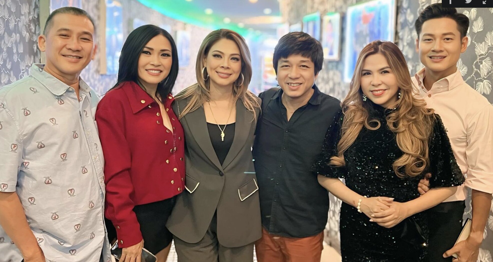 Ca sĩ Phương Thanh, Ngọc Ánh (đầu tiên và thứ hai từ phải qua) hào hứng tụ họp những gương mặt quen thuộc, hoạt động lâu năm trong làng nhạc. Đây là các ngôi sao đã gắn bó với âm nhạc của Lê Quang, từng nổi tiếng nhờ hát ca khúc của nhạc sĩ.