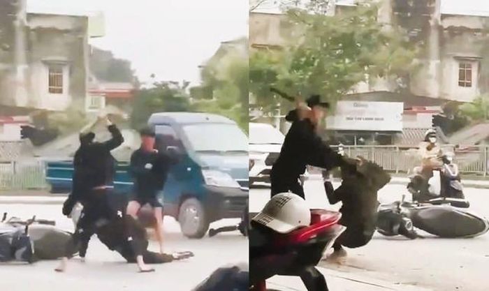 Qua hình ảnh đoạn clip người dân ghi lại cho thấy 1 nam thanh niên cầm 1 con dao dài xông tới chém xối xả vào người 1 nam thanh niên mặc đồ đen. Lúc này, có 1 thanh niên khác mặc quần đùi lao tới can ngăn, thế nhưng vẫn không thể ngăn được sự hung hãn của nam thanh niên cầm dao.