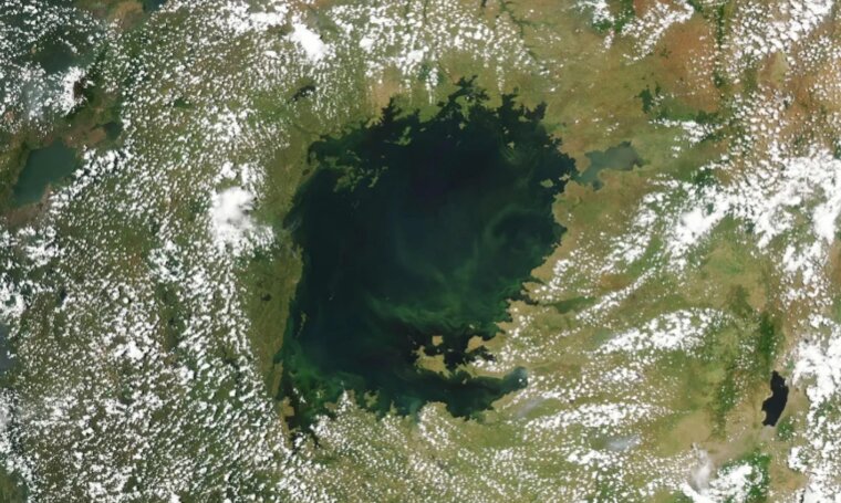 Tảo nở hoa độc hại đã biến một số khu vực của hồ Victoria thành "vùng chết". Ảnh: MODIS Land Rapid Response Team/NASA GSFC