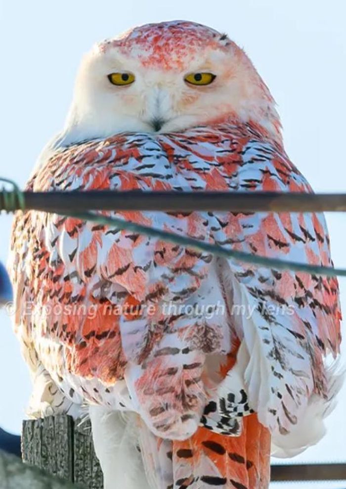 Con chim cú tuyết này đậu hoàn hảo trên một cột điện báo, nhưng thay vì chỉ có lông trắng như tuyết và sắc đen, lông của con cú này lại có thêm màu cam cực kỳ ấn tượng, ngộ nghĩnh. Ảnh: @julie Maggert.