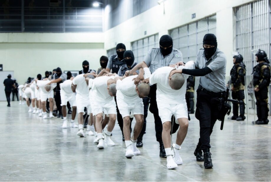 Nhân viên nhà tù chuyển những người bị trục xuất khỏi Mỹ tới nhà tù CECOT tại Tecoluca, El Salvador ngày 16/3. Ảnh: AP