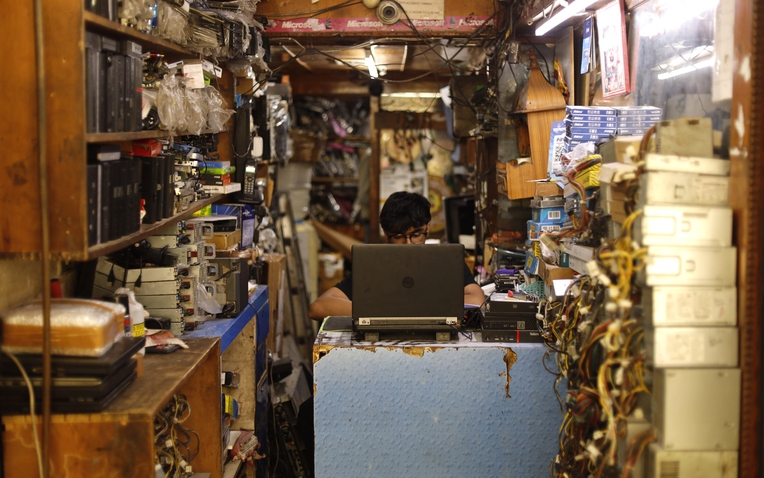 Trong một nơi sửa chữa nhỏ hẹp, thiếu ánh sáng tại chợ Nehru Place ở New Delhi, tiếng khoan nghe chạy rít lên và âm thanh của máy hàn vang vọng giữa không khí thật oi bức. Sushil Prasad, một kỹ thuật viên 35 tuổi, đang lau mồ hôi trên trán khi cẩn thận cho ghép lại "ruột gan của một chiếc laptop cũ". Đó là công việc hàng ngày của anh: cho tân trang lại những máy laptop cũ bằng cách ghép nối bo mạch chủ, màn hình và pin được tận dụng từ các thiết bị cũ hoặc rác thải điện tử để tạo ra những thiết bị có thể được tái sử dụng với chi phí thấp.