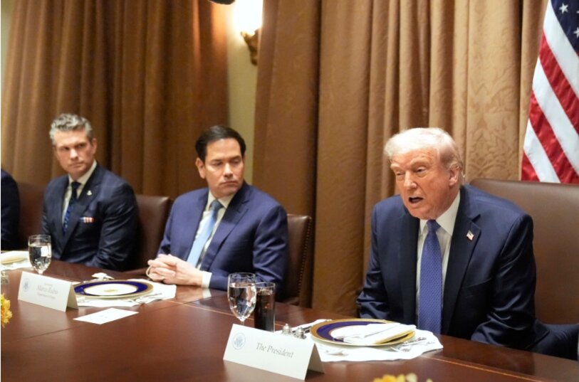 Tổng thống Trump (phải) và Ngoại trưởng Rubio, Bộ trưởng Quốc phòng Hegseth tại Nhà Trắng ngày 24/4. Ảnh: AP