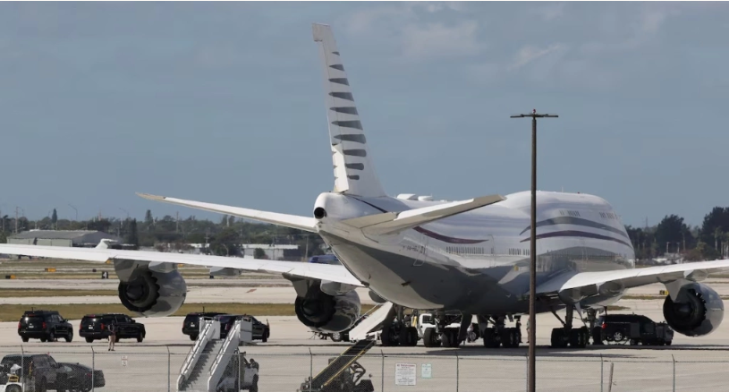 Chiếc Boeing 747-8, từng được chính phủ Qatar sử dụng, tại sân bay Palm Beach ngày 15/2. Ảnh: Reuters