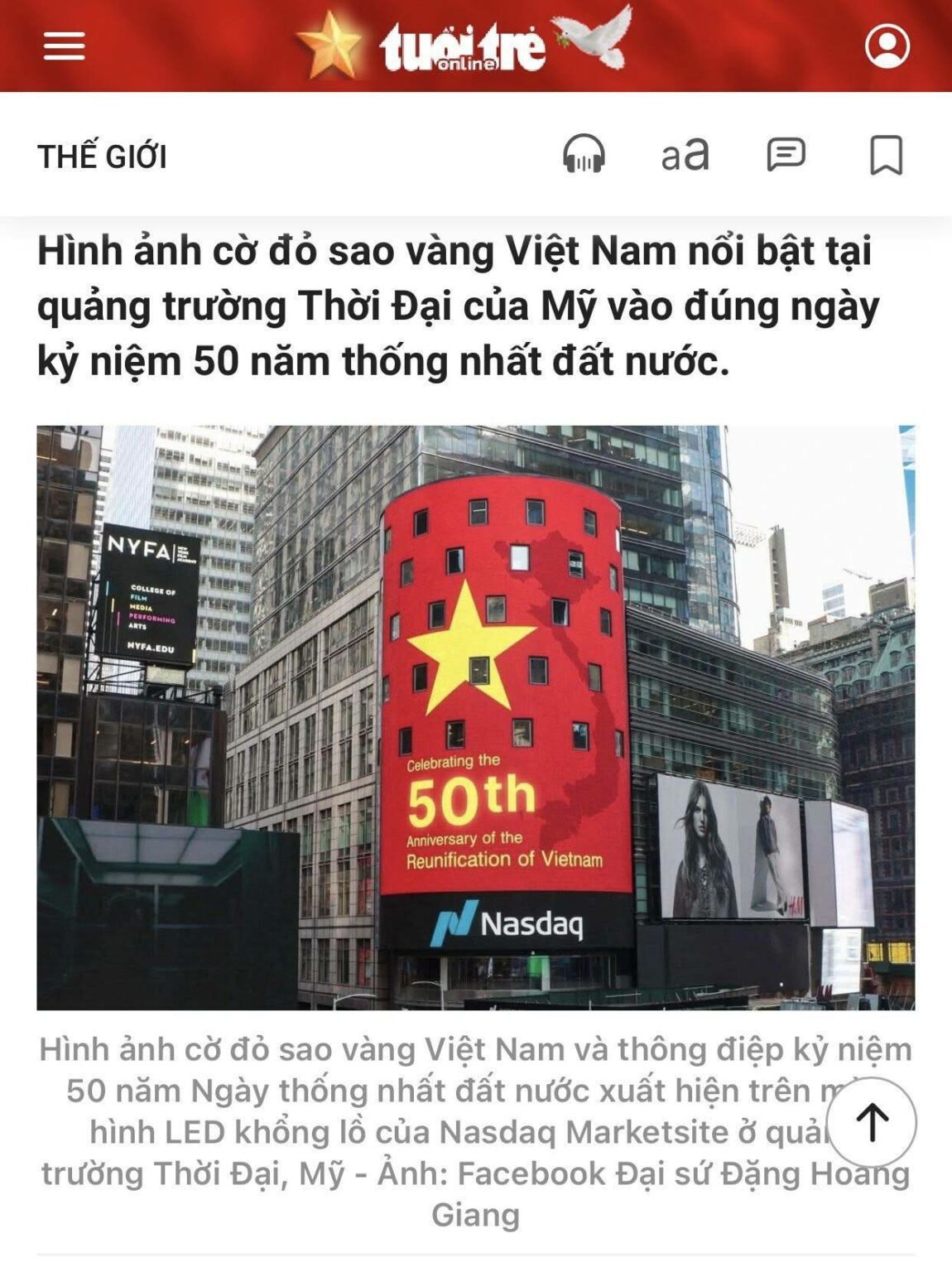 "Kỷ niệm 50 năm ngày thống nhất Việt Nam", khi tung hô rằng đã xuất hiện trên màn hình lớn của công ty NASDAQ ở Quảng Trường Thời Đại tại New York, Mỹ.