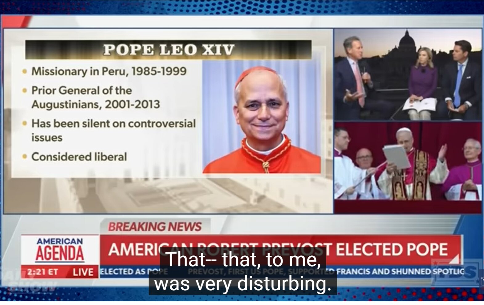 Xứ ngôn viên đài Newsmax tỏ ra rất bất bình: "Ông ấy đã nói tiếng Tây Ban Nha. Ông ấy là một người Mỹ, nhưng lại không nói tiếng Anh. Ông ấy phát biểu bằng hai thứ tiếng, Tây Ban Nha và Ý. Tôi không biết làm sao bạn cho ông ấy là 'American Pope' nhưng lại không nói ngôn ngữ địa phương của mình. Điều đó... điều đó, với tôi là rất phiền toái."