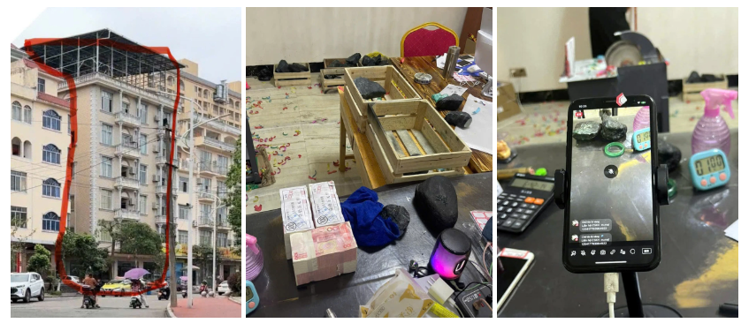 Tòa nhà tại Trung Quốc được các đối tượng thuê để làm địa điểm tổ chức cắt đá lừa đảo. Các viên đá được phun sơn như thật, sau đó, các đối tượng dùng điện thoại để livestream cắt đá tìm ngọc. Ảnh: CACC