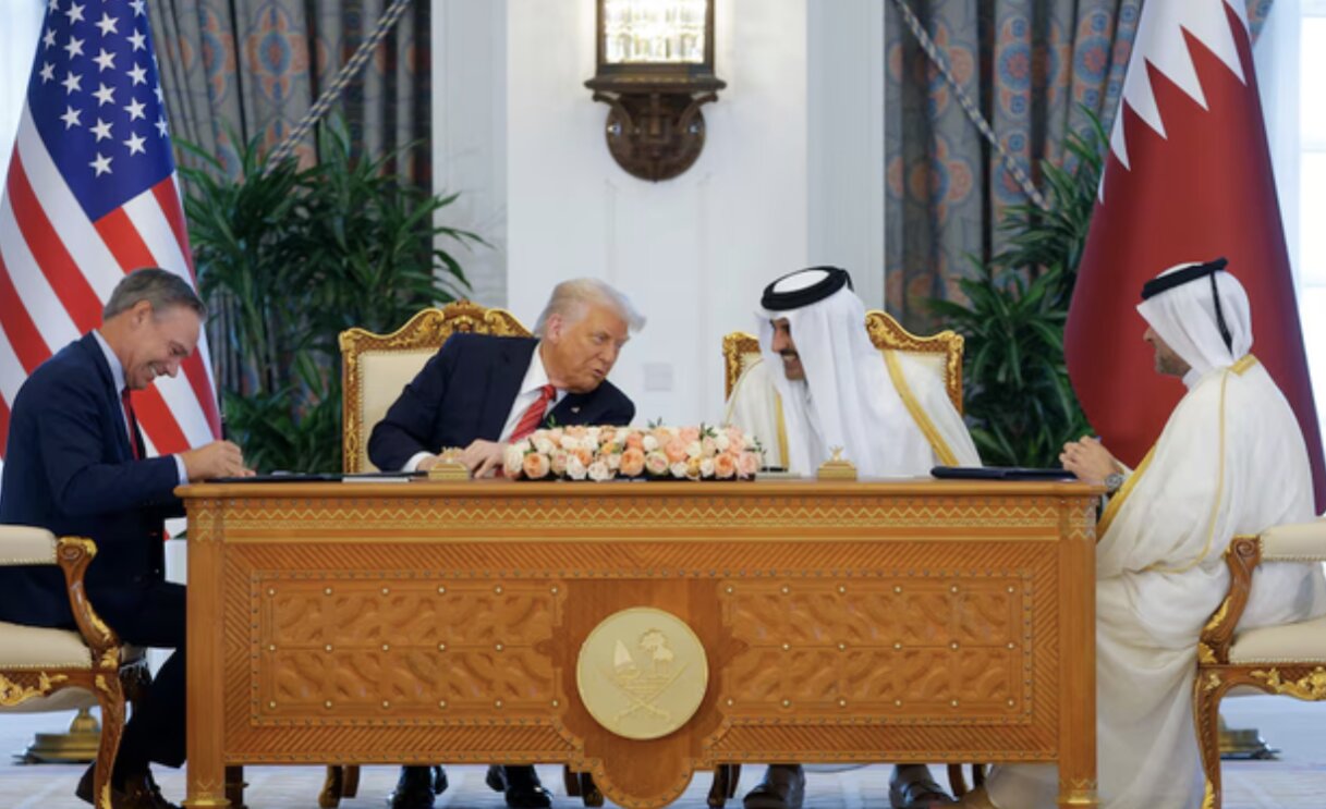Lễ ký kết hợp đồng mua máy bay giữa Boeing và Qatar Airways có sự chứng kiến của Tổng thống Mỹ Donald Trump và Quốc vương Qatar Sheikh Tamim bin Hamad Al-Thani, nhân chuyến thăm Qatar của ông Trump.
