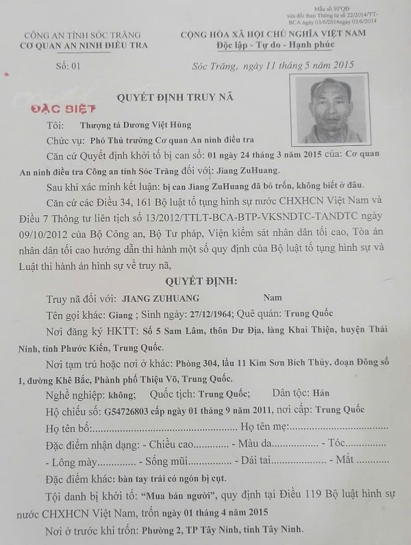 Công an tỉnh Sóc Trăng ra quyết định truy nã đối với Jiang Zuhuang vì bỏ trốn sau khi bị khởi tố về tội "Mua bán người". Ảnh: Công an Sóc Trăng