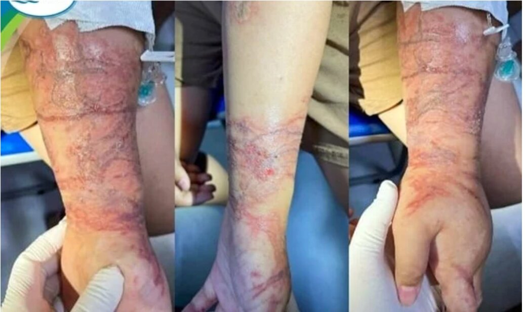 Đôi tay của bệnh nhi đầy vết "roi đánh", tổn thương da nặng, bao gồm dát đỏ, sẩn đỏ, mụn nước, phỏng nước thành vệt, sưng nề, trợt rỉ dịch...