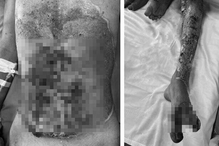 Gần hai tuần sau, vết bỏng tại vùng bụng và cẳng chân trái bắt đầu có biểu hiện nhiễm trùng, chảy dịch, mưng mủ và bốc mùi hôi. Chỉ đến khi các dấu hiệu trở nên nghiêm trọng, người bệnh mới được người nhà đưa đến Bệnh viện Việt Nam - Thụy Điển Uông Bí (Quảng Ninh). Lúc này, toàn thân người bệnh suy kiệt, nguy cơ hoại tử cao.