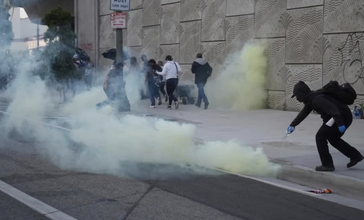 Hình ảnh từ hiện trường cho thấy lực lượng của Sở cảnh sát Los Angeles xếp hàng trên con phố ở trung tâm, dùng dùi cui và súng bắn hơi cay để đối phó với người biểu tình, sau khi chính quyền yêu cầu đám đông giải tán vào lúc chạng vạng tối 6/6 (theo giờ Mỹ).