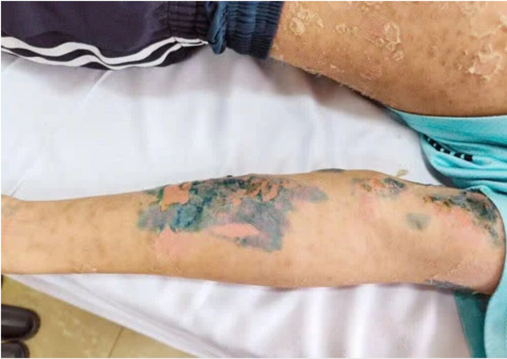 Tổn thương của người bệnh khi nhập viện Tại bệnh viện, các bác sĩ chẩn đoán người bệnh bị viêm da tiếp xúc bội nhiễm. Người bệnh đang được điều trị kháng sinh kết hợp chăm sóc da tổn thương.