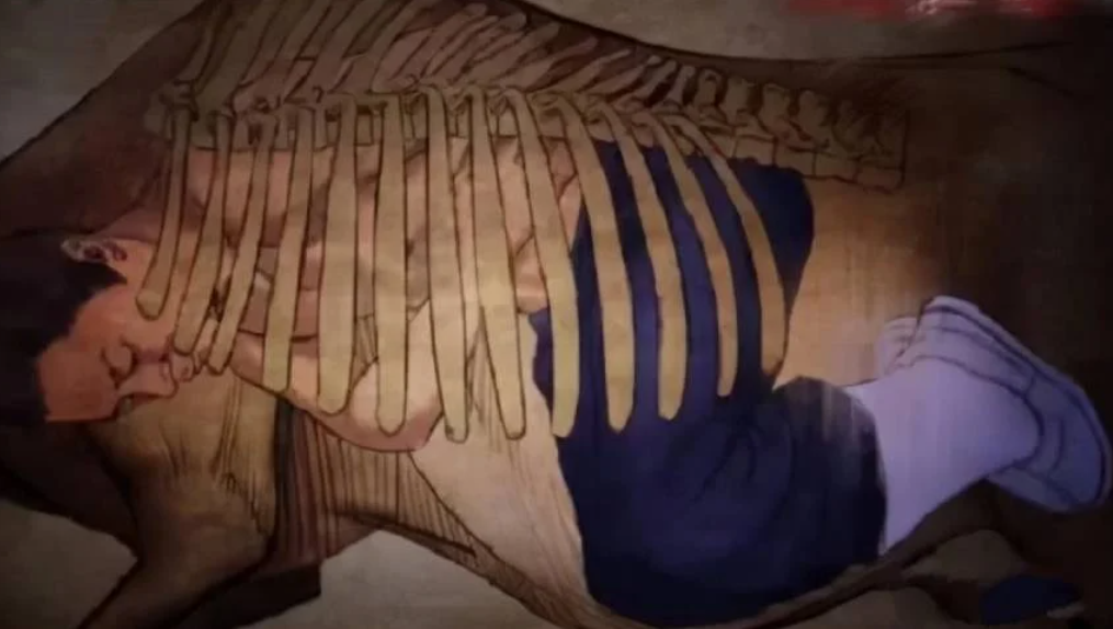Đặt người bị thương vào bụng bò. Ảnh: Soundofhope.
