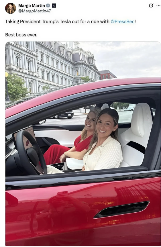 Thư ký báo chí Nhà Trắng Karoline Leavitt và trợ lý lâu năm Margo Martin đã lái thử chiếc Tesla vào ngày 30/5/2025. Ảnh: MSN.