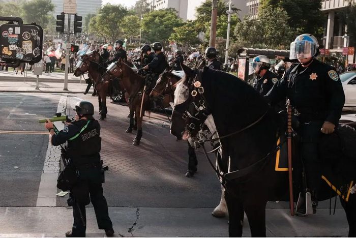 Cảnh sát Los Angeles đối phó người biểu tình hôm 11-6. Ảnh: THE NEW YORK TIMES
