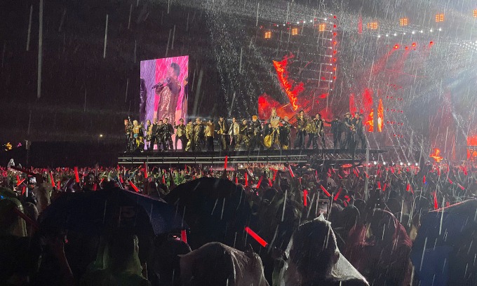 Hàng chục nghìn khán giả đứng dưới mưa rào kéo dài hàng giờ, cổ vũ các nghệ sĩ trong concert "Anh trai vượt ngàn chông gai", tối 15/6.