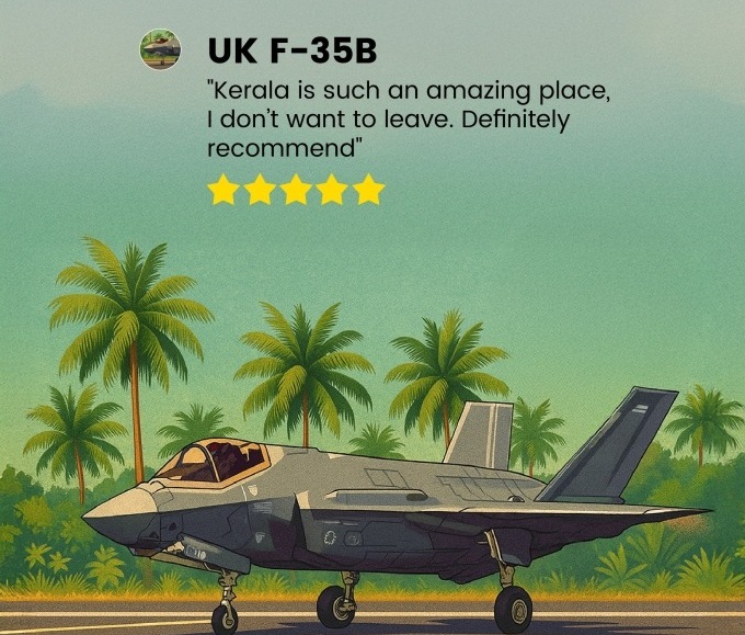 Hình ảnh đăng kèm bài viết là bức tranh do AI thực hiện, cho thấy tiêm kích tàng hình F-35B Anh đứng trước hàng dừa, với dòng chữ "Kerala là nơi tuyệt vời. Tôi không muốn rời đi. Chắc chắn sẽ giới thiệu nơi này" và đánh giá 5 sao.