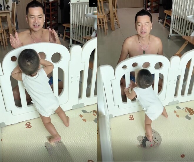 Trong clip, bé Dustin khi nghe tiếng bố gọi liền bám lên hàng rào đứng dậy. Dù nhóc tì còn đứng chưa vững, song Quang Minh rất tự hào, không ngừng vỗ tay để cổ vũ con trai. Làm bố ở tuổi U70, nam nghệ sĩ luôn cố gắng dành thời gian ở bên quý tử, chứng kiến từng khoảnh khắc bé trưởng thành. Xem qua khoảnh khắc Quang Minh tập đứng cho con, khán giả không khỏi cảm thấy bình yên, ấm áp.