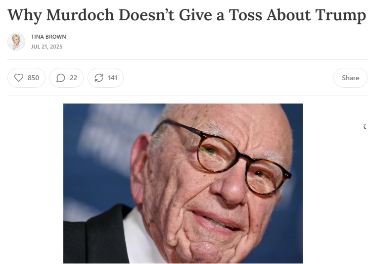 Lần này thì không. Tuần trước, Emma Tucker, tổng biên tập gan dạ của tờ Wall Street Journal thuộc sở hữu của Murdoch, đã phải chịu khuất phục trước lời chỉ trích gay gắt của Trump nhằm vào bà, yêu cầu bà dừng xuất bản bài báo giật gân của tờ báo, trong đó có hình vẽ khiêu dâm một phụ nữ khỏa thân trong lời chúc mừng sinh nhật lần thứ 50 của Trump gửi đến Jeffrey Epstein. Tổng thống, người có ba bức vẽ đường chân trời thành phố New York được bán đấu giá vào năm 2017, đã nổi giận trên Truth Social, "Tôi không vẽ tranh", và đe dọa sẽ "kiện [Murdoch] đến chết", và ông đã thực hiện thành công bằng một vụ kiện trị giá 10 tỷ đô la.