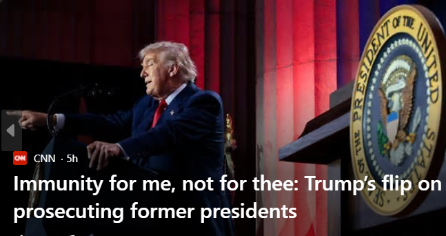 Nhưng nó cũng rất mâu thuẫn. Trump và các luật sư của ông ta lập luận rằng các tổng thống phải được miễn trừ hoàn toàn vì điều đó hoàn toàn cần thiết cho công việc hành pháp. Nhưng rồi ông ta lại quay ngoắt lại và, chỉ hơn một năm sau, lại cho rằng những tiêu chuẩn đó không nên được áp dụng cho người tiền nhiệm của ông ta đối với những hành động có vẻ chính thức hơn nhiều so với hành động của chính Trump.