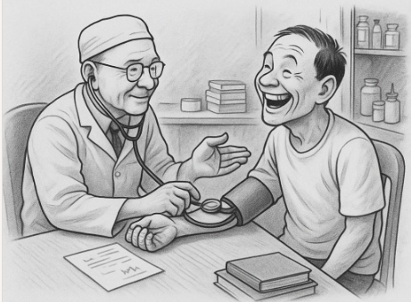 Bác sĩ mỉm cười thông cảm và biên cho một cái toa.