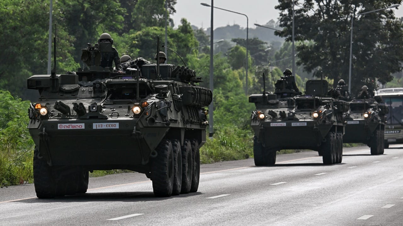 Binh lính Quân đội Hoàng gia Thái Lan trên xe bọc thép trên một con đường ở tỉnh Chachoengsao vào ngày 24 tháng 7 năm 2025. Ảnh Moneycontrol