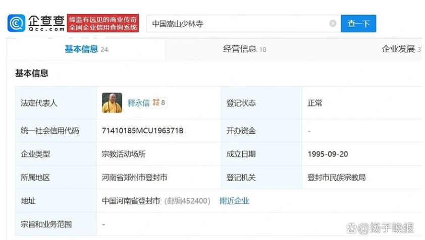 Thiếu Lâm Tự được đăng ký pháp nhân từ năm 1995 với đại diện là Thích Vĩnh Tín. Đây là cơ sở tôn giáo do Cục Tôn giáo thành phố Đăng Phong, tỉnh Hà Nam, quản lý. Đơn vị này vẫn đang hoạt động hợp pháp theo dữ liệu doanh nghiệp Trung Quốc.: QCC