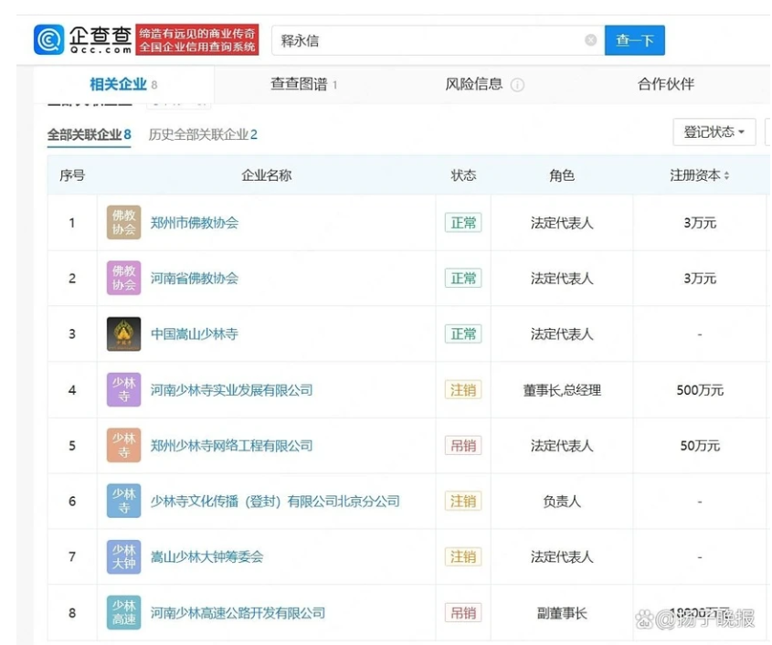 Theo nền tảng dữ liệu doanh nghiệp Tianyancha, hiện ông Thích Vĩnh Tín còn liên quan đến khoảng 10 công ty, nhưng một nửa trong số đó đã bị giải thể, thu hồi giấy phép hoặc hủy đăng ký.