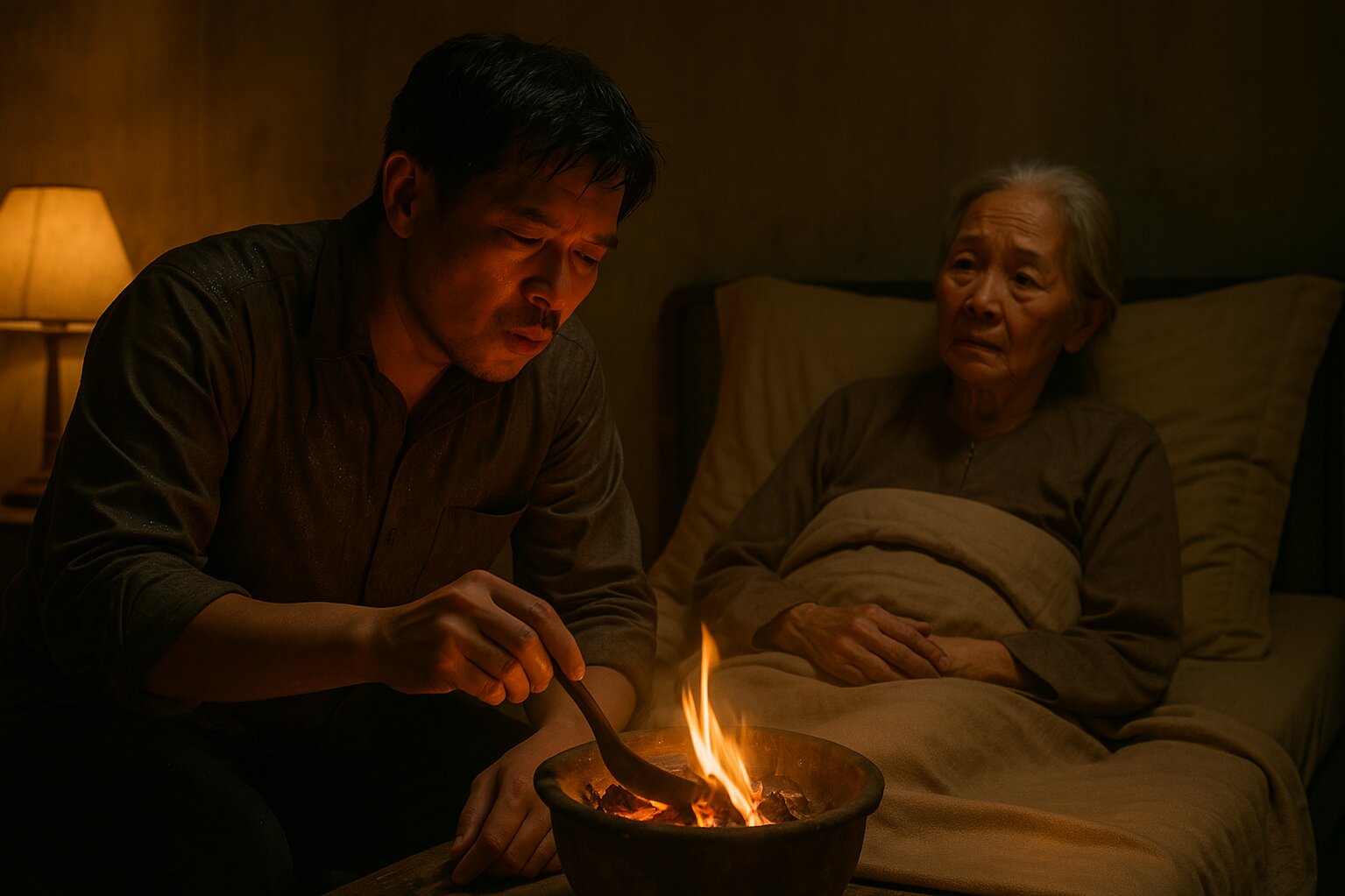Không đèn, không tiếng tivi. Chỉ có tiếng ho yếu ớt, và mùi ẩm thấp của trời mưa luồn vào từng ngóc ngách. Minh đặt túi đồ xuống, tháo vội chiếc áo mưa rồi bước tới bên giường: