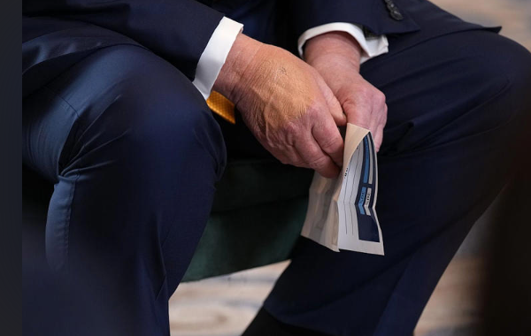Vết bầm tím trên tay ông đặc biệt rõ ràng khi tổng thống phát biểu với giới truyền thông tại Bãi cỏ phía Nam của Nhà Trắng hôm thứ Sáu trước khi ông lên đường tới Scotland trên trực thăng Marine One.