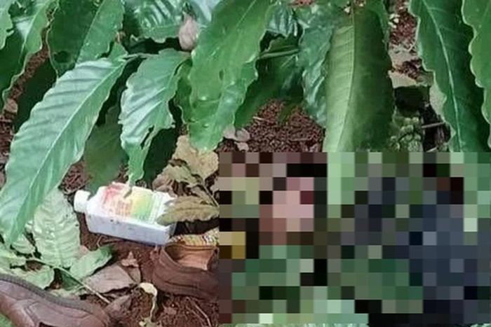 Nghi phạm được phát hiện nằm bất động trong rẫy cà phê, cạnh bên là chai thuốc độc (Ảnh: Phi Phi).
