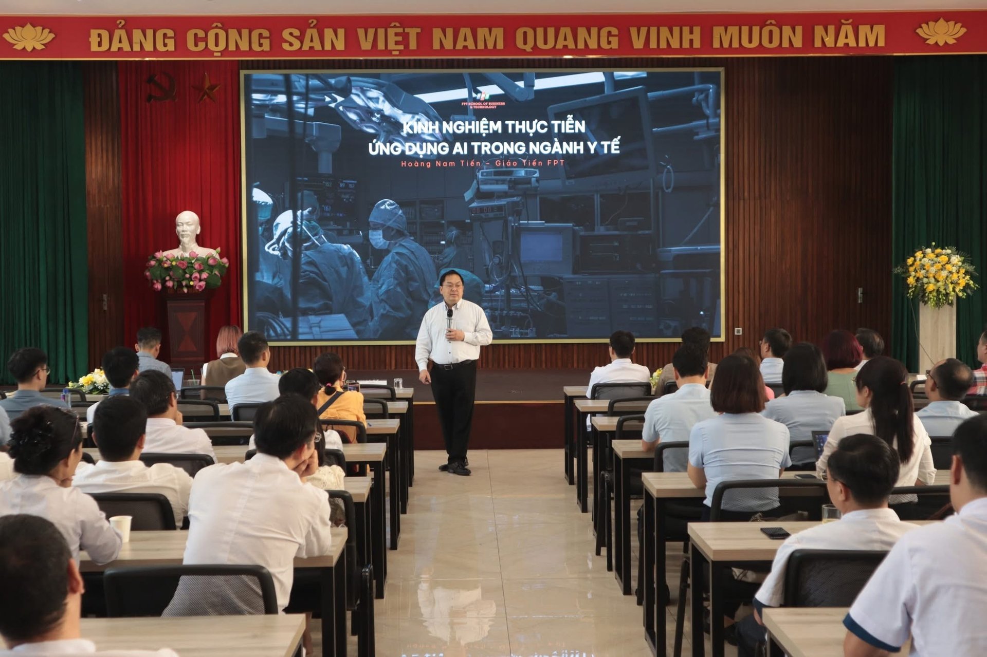 Hình ảnh ông Hoàng Nam Tiến giảng cho các bác sĩ về ứng dụng AI trong y tế tại Bệnh viện E (Hà Nội) ngày 18/7 vừa qua. Ảnh: NVCC