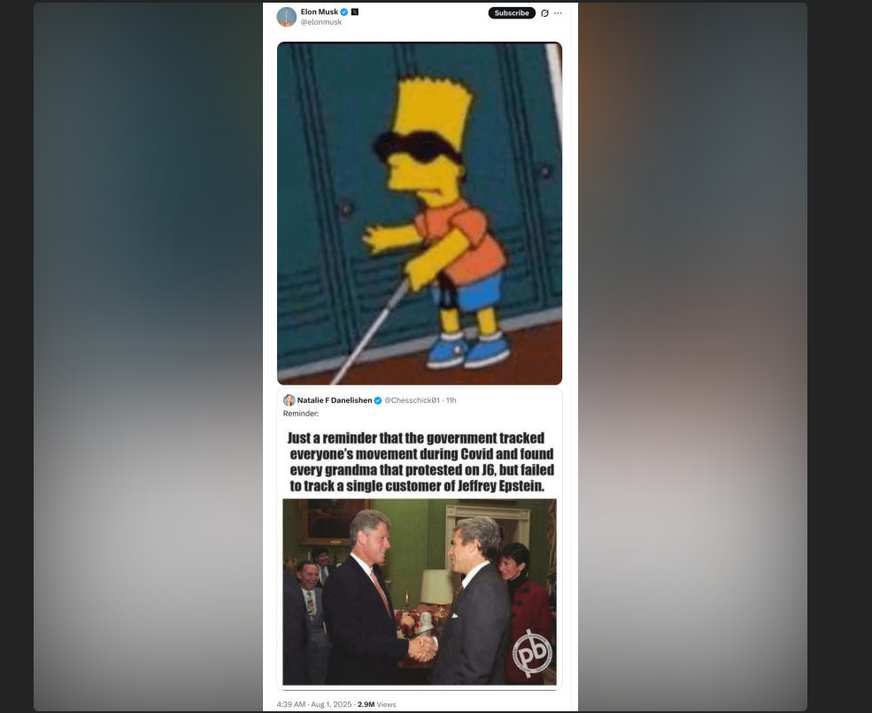 Musk đã thêm hình ảnh Bart Simpson giả vờ bị mù, tiếp tục chế giễu việc thực thi pháp luật có chọn lọc của chính phủ. Động thái này tiếp tục củng cố đường lối của Musk trong việc thu hút sự chú ý vào vụ án Epstein và gây áp lực lên những người nắm quyền - bao gồm cả Donald Trump - vì đã không vạch trần các khách hàng của Epstein.