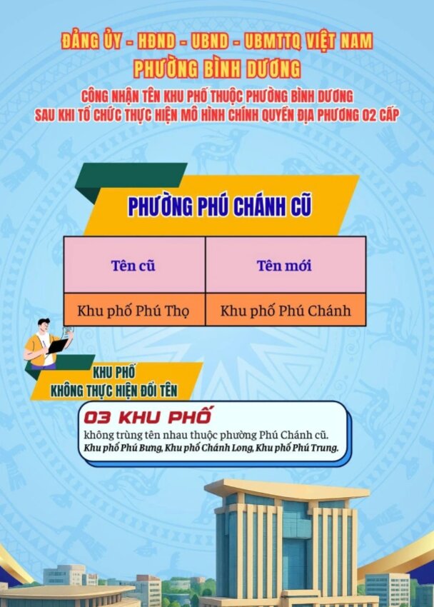Tại buổi lễ, phường Bình Dương đã công bố Nghị quyết công nhận việc đổi tên 17/20 khu phố trực thuộc phường. Địa phương này có 20 khu phố, trong đó, có 3 khu phố vẫn giữ nguyên tên cũ do không trùng lắp, 17 khu phố trùng lắp tên sau sáp nhập, thành lập mới phường Bình Dương.