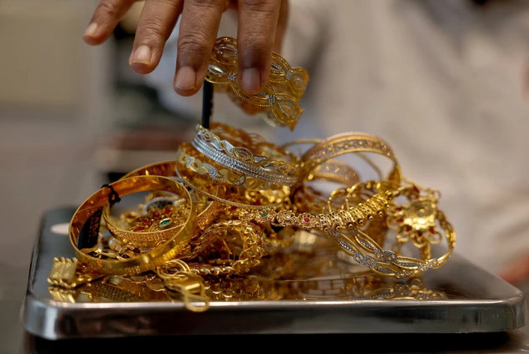 Một thợ kim hoàn cân vàng trang sức ở Ahmedabad, Ấn Độ, ngày 31/7. Ảnh: Reuters