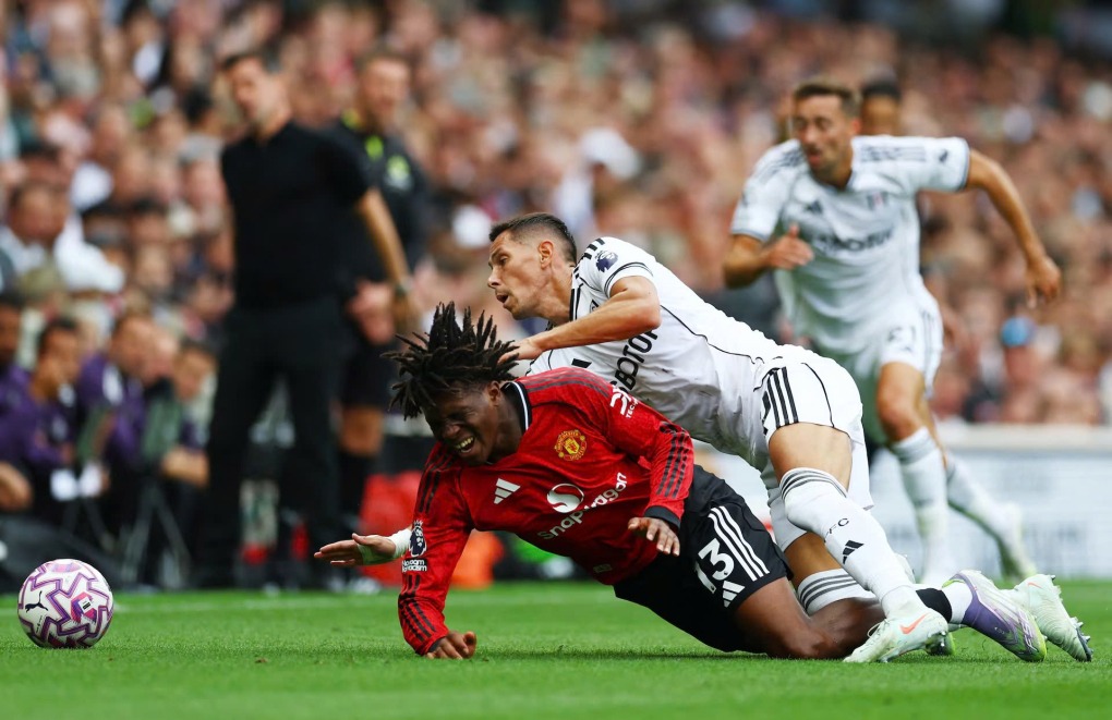 Hậu vệ Patrick Dorgu (áo đỏ) tranh chấp với cầu thủ Fulham. Ảnh: Reuters