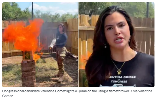Một ứng cử viên Quốc hội cực hữu tại Texas, nổi tiếng với những trò hề gây phẫn nộ, đã chia sẻ một video vận động tranh cử mới hôm thứ Hai, trong đó cô ta dùng súng phun lửa để đốt Kinh Quran, tuyên bố nước Mỹ là "quốc gia Cơ đốc giáo" và yêu cầu trục xuất người Hồi giáo.