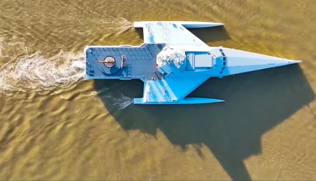Theo ảnh và video lan truyền trên mạng, con tàu không người lái này được vận chuyển bằng xe rơ-moóc hạng nặng và có một số thiết kế để “tàng hình”, bao gồm các bề mặt nghiêng, thân tàu nhiều mặt cắt và phần kết cấu bên trên được che giấu.