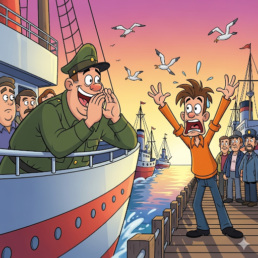 Khi con tàu chuẩn bị rời bến, người bạn bỗng hốt hoảng chạy ra bờ, tay chân vung loạn xạ. Anh chồng thấy thế liền chụm tay làm loa hét lớn: