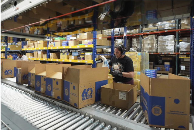 Nhân viên một doanh nghiệp đang xử lý những kiện hàng tại nhà kho ở bang Illinois, Mỹ