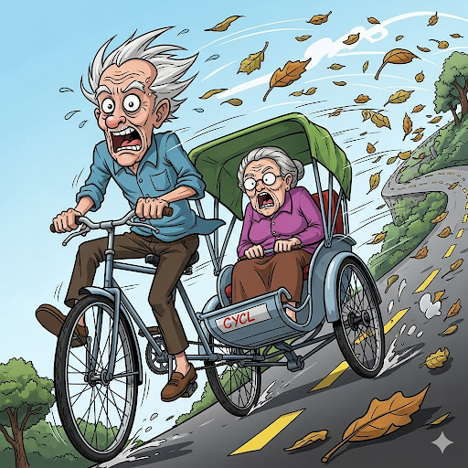 Một ông già đạp xích lô chở một bà già từ trên dốc cao lao xuống. Gió thổi vù vù, bà già run cầm cập, hai tay bám chặt vào thành xe, mặt tái mét, lo lắng nói: