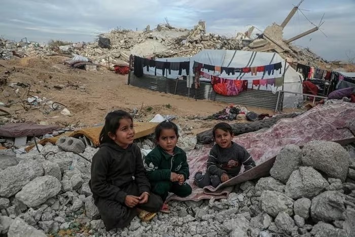 Các em nhỏ ngồi trên đống đổ nát của ngôi nhà bị phá hủy do xung đột ở Gaza. Nguồn: THX