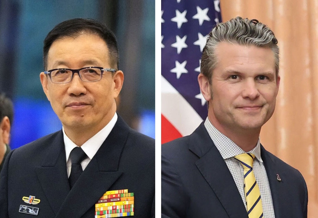 Bộ trưởng Quốc phòng Mỹ Pete Hegseth (phải) và Bộ trưởng Quốc phòng Trung Quốc Đổng Quân. Ảnh: Kyodo News