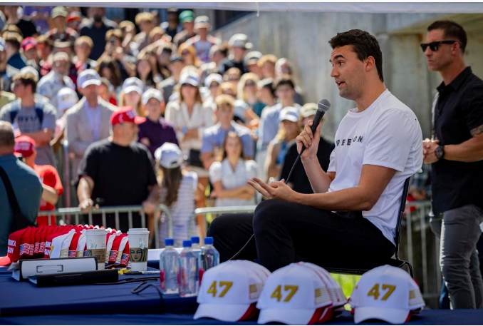 Mặc chiếc áo phông trắng in dòng chữ "Tự do" màu đen, Kirk đắm mình trong tiếng reo hò của những người hâm mộ và cả phản đối anh. Diễn giả trẻ ném những chiếc mũ đỏ trắng in chữ "Làm nước Mỹ vĩ đại trở lại" và có hình số "47", tượng trưng cho nhiệm kỳ của Tổng thống Donald Trump, về phía đám đông.