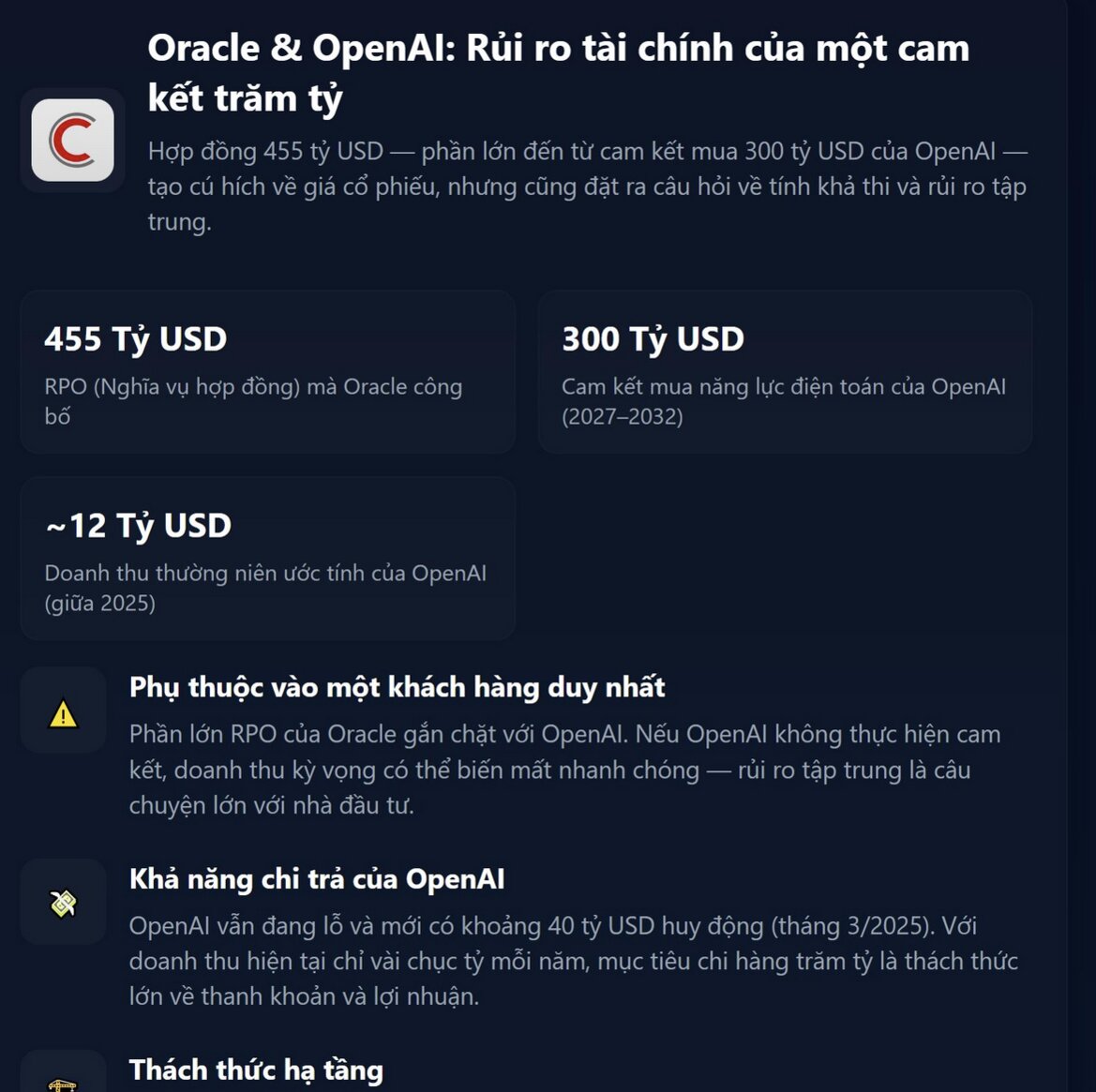 Nếu OpenAI không thể thực hiện đúng lộ tŕnh chi tiêu, Oracle sẽ đối diện với cú sốc doanh thu, bởi phần lớn con số 455 tỷ USD chỉ nằm trên giấy tờ. Nếu OpenAI gặp bất kỳ vấn đề nào, từ sự thay đổi chiến lược, thất bại trong việc thương mại hóa sản phẩm, hay đơn giản là không thể t́m đủ nguồn tài chính, toàn bộ doanh thu tiềm năng của Oracle có thể bốc hơi. Mặc dù Oracle có nhiều khách hàng khác, nhưng không có hợp đồng nào sánh được về quy mô với thỏa thuận với OpenAI.
