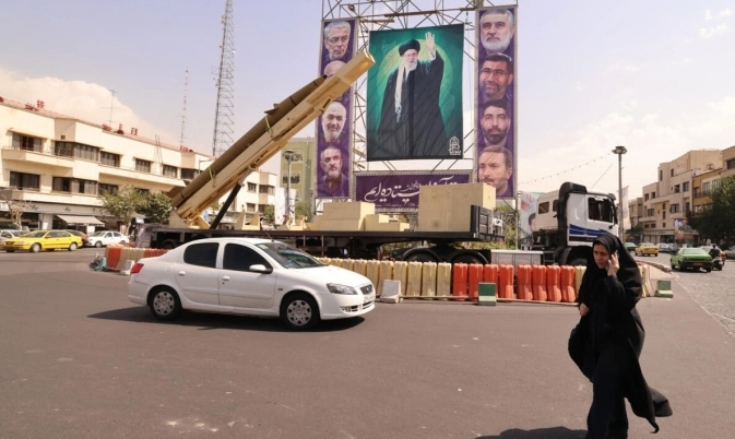 Người phụ nữ đi ngang khu vực trưng bày tên lửa ở Tehran hôm 27/9. Ảnh: AFP