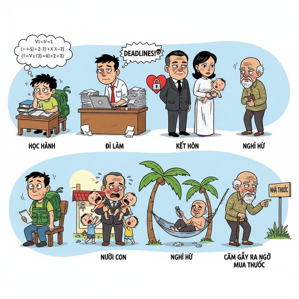 - 78 tuổi: Tôi nằm trên giường b,ệ,nh, tỉnh lại sau cơn mê, xung quanh là những người thân bạn bè, đồng nghiệp..vợ và con tôi bắt đầu khóc...Tôi nhận ra...Tôi đang ở rất gần ngưỡng cửa tử thần... Tôi muốn để lại chút tài sản cho con cháu, nhưng chợt nhớ ra, mình cũng đã bán sạch để chữa b,ệ,nh mấy năm qua.