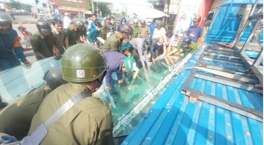 Sự cố khiến hai công nhân bị kẹt cứng, nằm bất động bên dưới các tấm kính. Phát hiện vụ việc, Công an xã Bình Đức phối hợp lực lượng liên quan, cùng người dân nhanh chóng di chuyển được khoảng 10 tấm kính, giải cứu thành công hai nạn nhân.