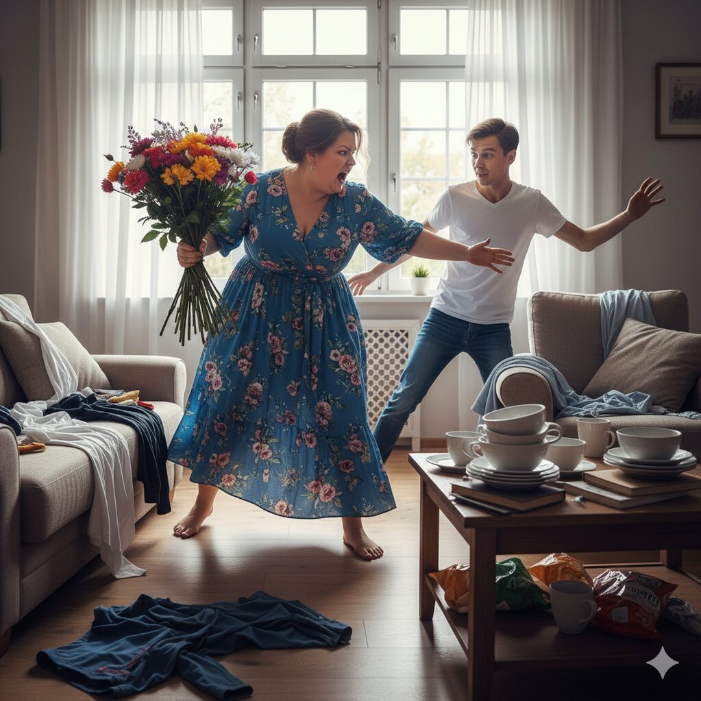 Căn phòng lập tức im phăng phắc 3 giây. Rồi một cơn gió nổi lên, chiếc dép bay vèo qua đầu người chồng, kế đến là bó hoa vừa cắm dở trên bàn bị nhổ luôn ra làm “vũ khí”!